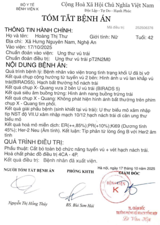 O Hoàng Thị Thư sinh năm ngày 10/2/1984. O bị ung thư vú vào viện mổ ngày 17/10/2025 trong tình trạng khối u đã lan rộng và bị vỡ, O đang trong liệu trình hoá trị nhưng O đã xin ngưng điệu trị vì do sức khoẻ đã quá yếu, bệnh đã di căn (giai đoạn cuối). Hoàn cảnh gia đình đặc biệt khó khăn, không có điều kiện kinh tế, O không có chồng, không có con hiện tại ở nhờ nhà em gái không ai chăm sóc (gia đình em gái cũng khó khăn và đang đi làm xa ở Hà Nội), bản thân O lắng không đủ khả năng lo liệu hậu sự cho mình khi qua đời. Nguyện vọng của O là xin giúp đỡ một áo quan để khi nhắm mắt xuôi tay O được an nghỉ. Sđt O Thư: 0977146168