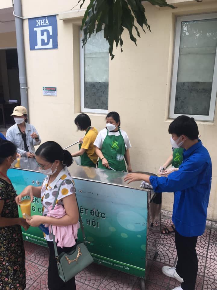Do trời mưa nên cháo phát trong nhà E của bệnh viện. Cơn mưa rào không làm nguội được sức trẻ hừng hực đang chảy trong người các em sinh viên tình nguyện.