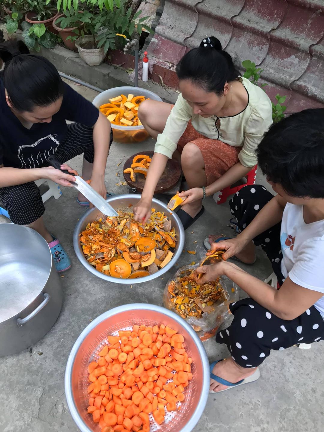 (Rửa lại 2 nồi to, 6 nồi nhỏ, muôi nấu, máy xay, rửa nhân rau. 1 bếp luộc nhân rau bí đỏ carrot, 1 bếp đặt nồi to đổ nước đầy 2/3 đun to lửa. Các công việc hoàn thành khoảng 12h)