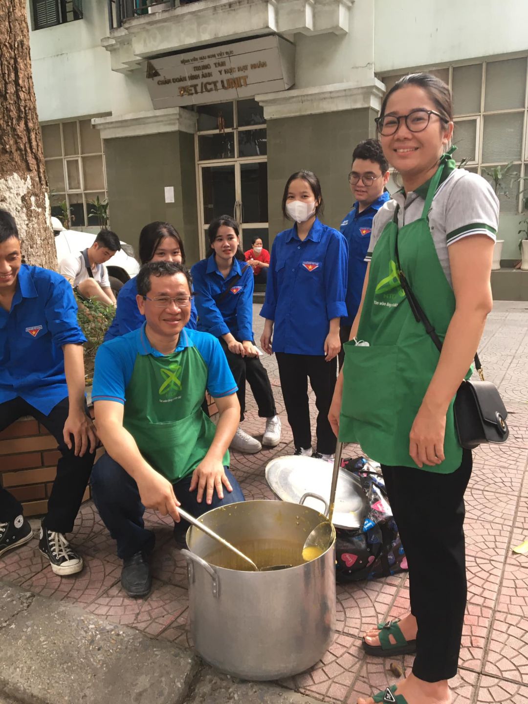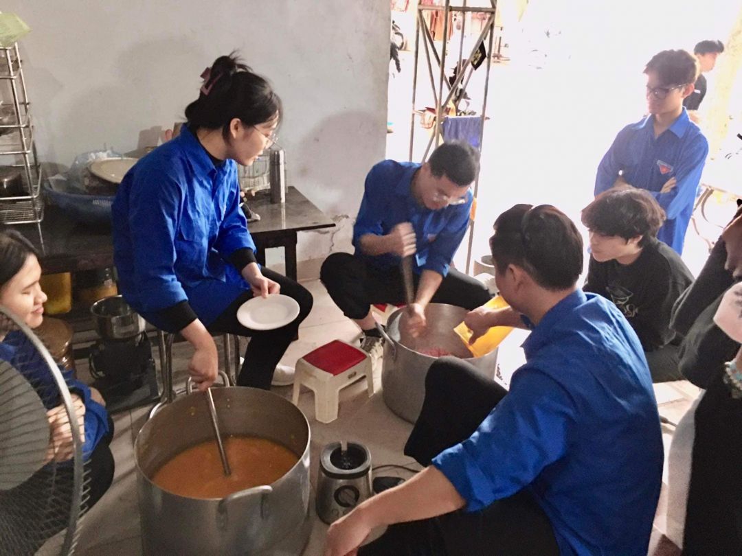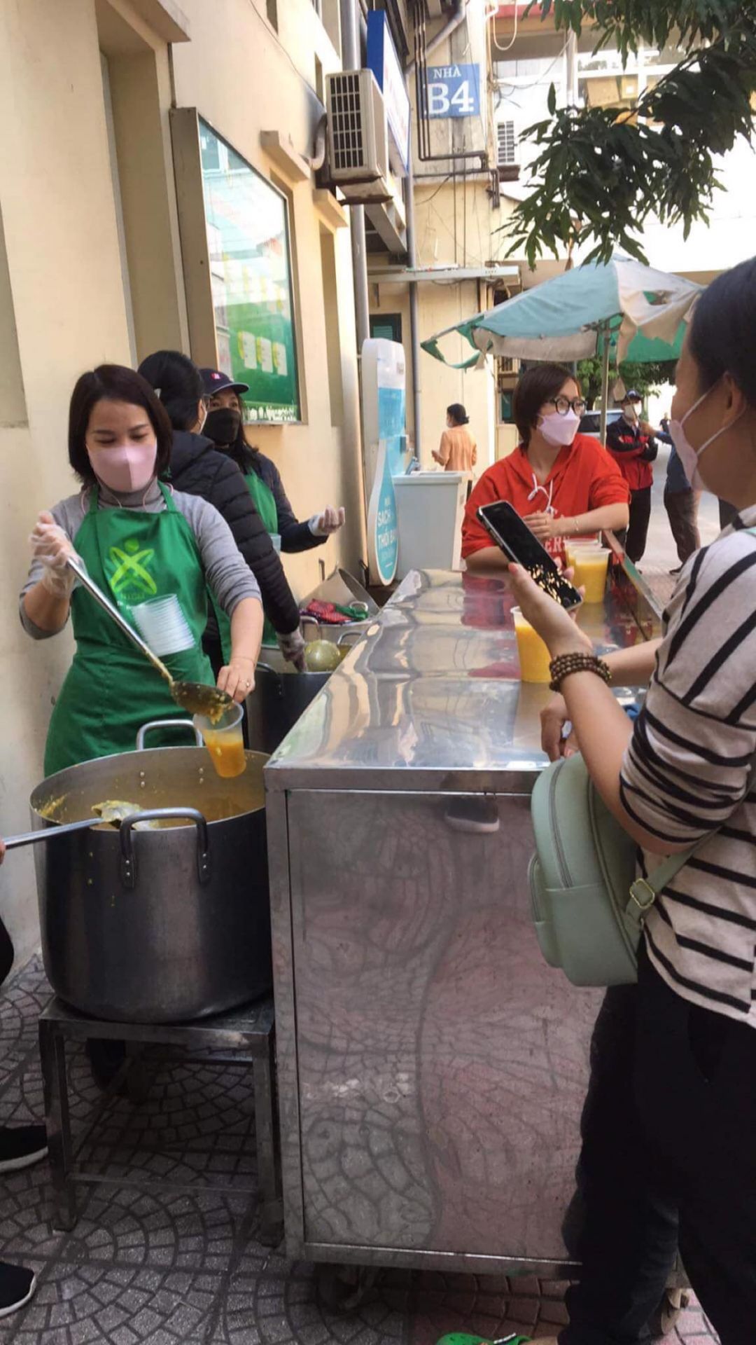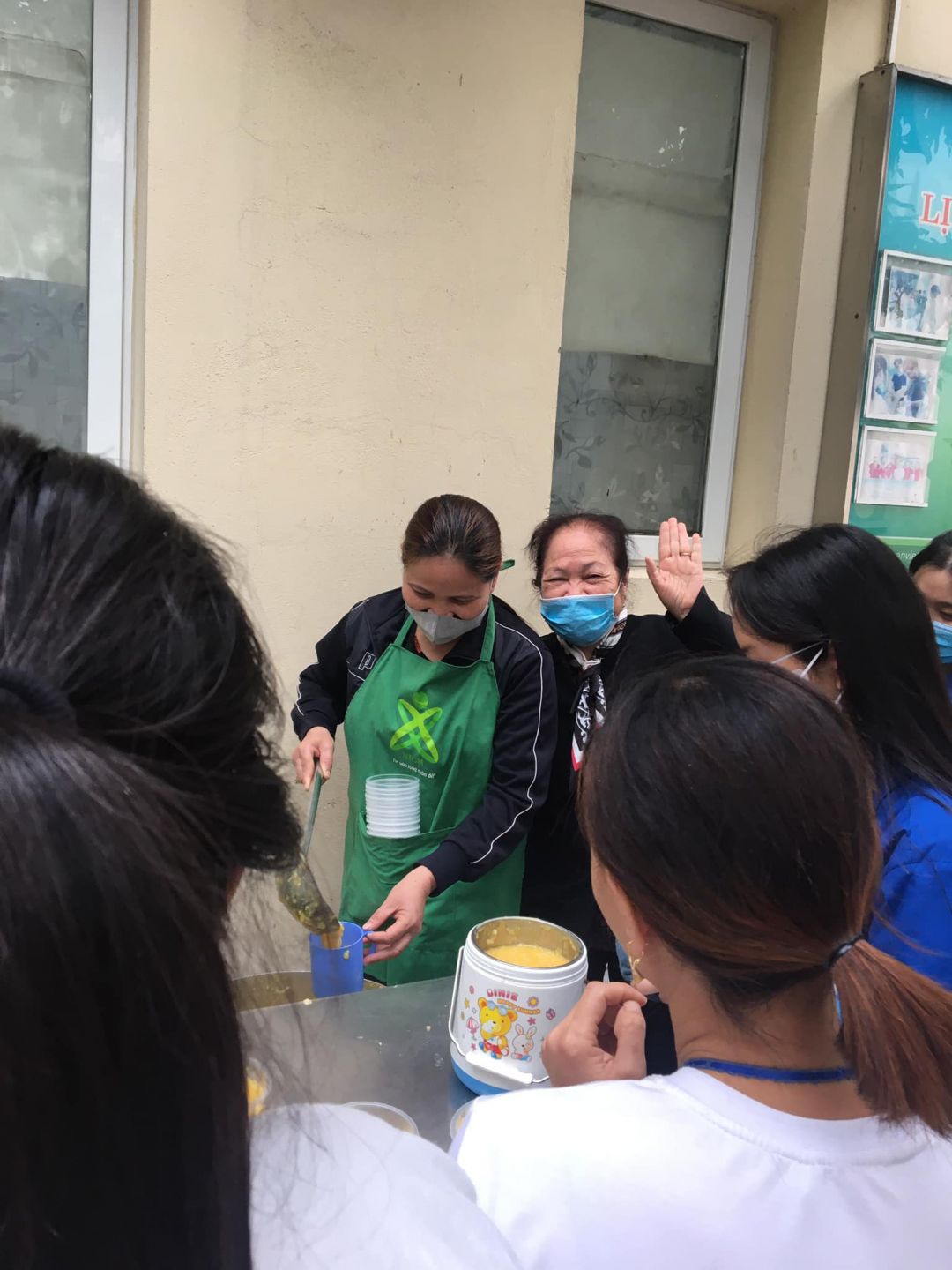 Tuần nào chị Ngoan leader thì tuần đó cháo đắt như tôm tươi. Các em sinh viên đại học Thăng Long nấu và phát cháo.