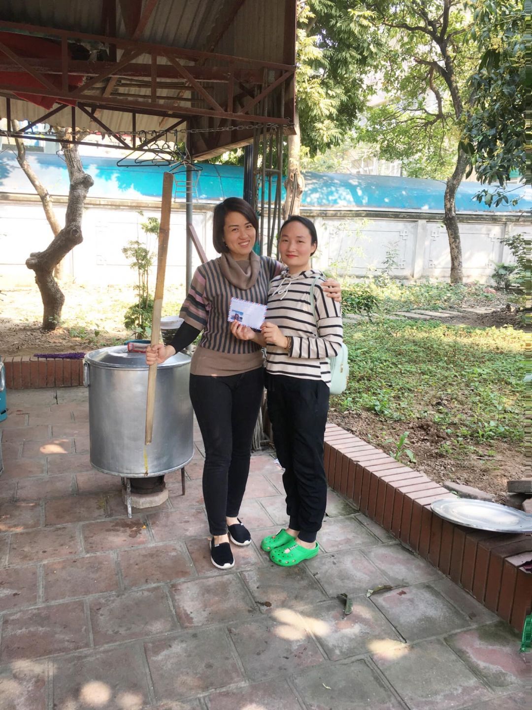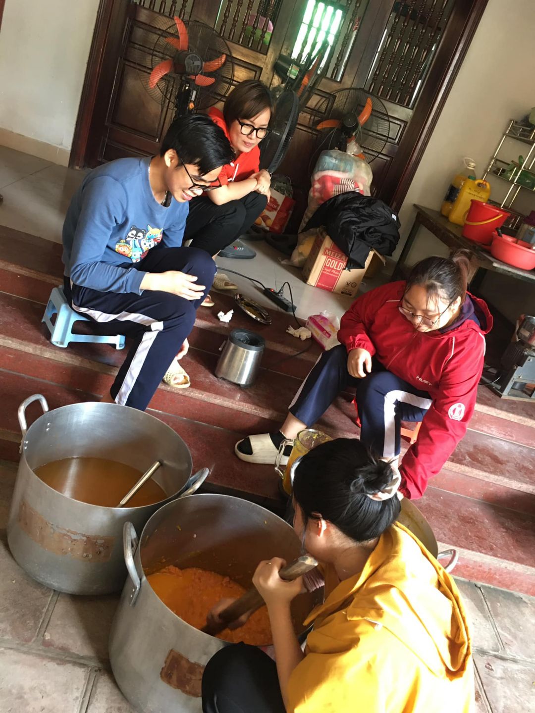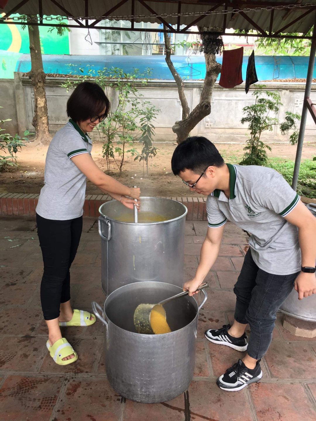 Tuần này đến nấu cháo có thầy cô, phụ huynh, học sinh trường liên cấp Newton, lực lượng rất đông. Buổi chiều nấu cháo xong còn lại 5 thành viên, Vừa mời cháo vừa phát cháo.