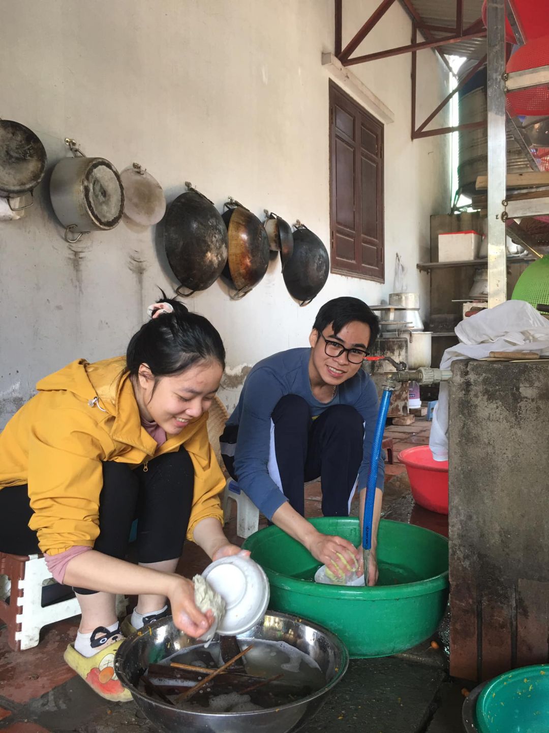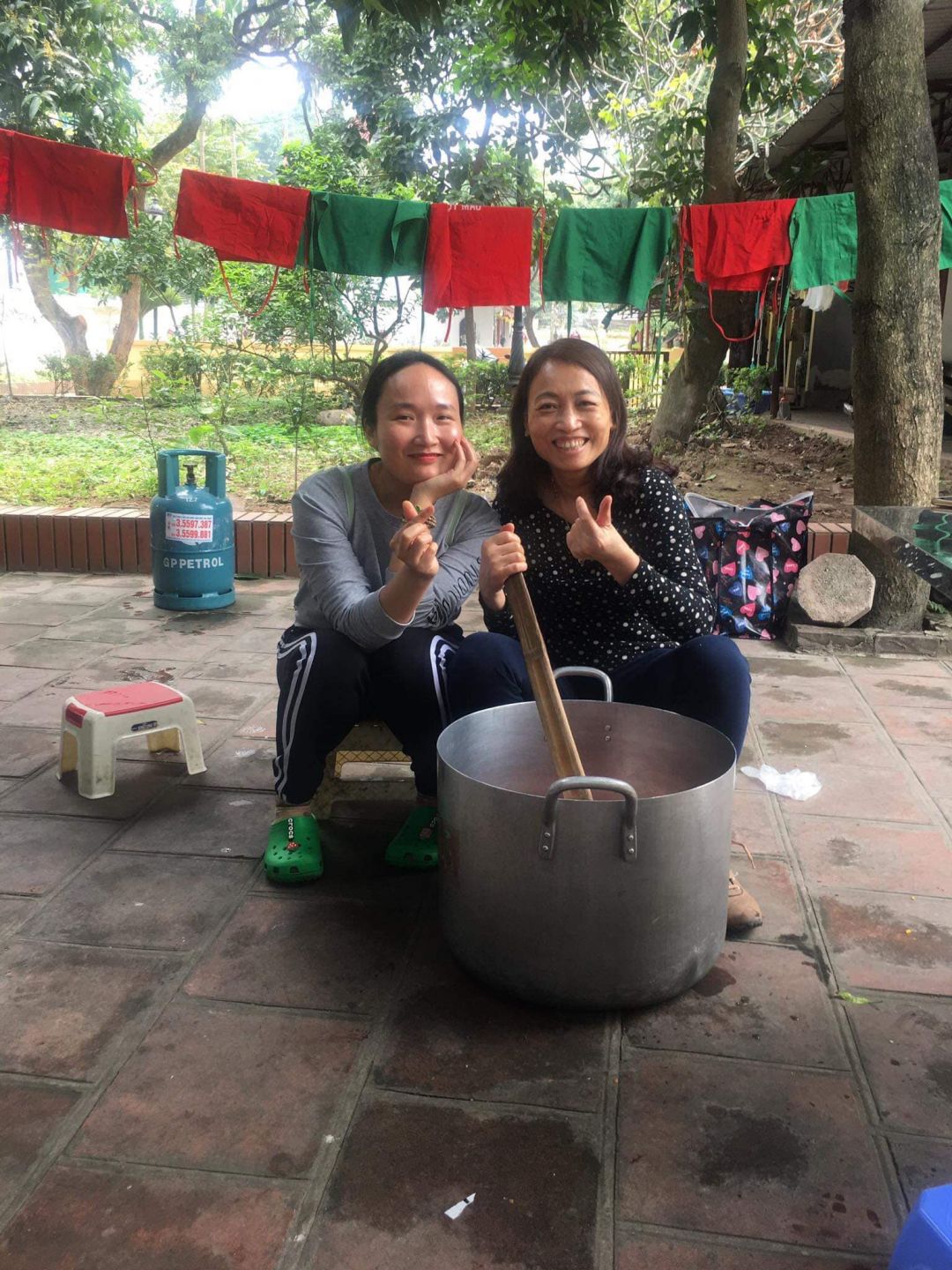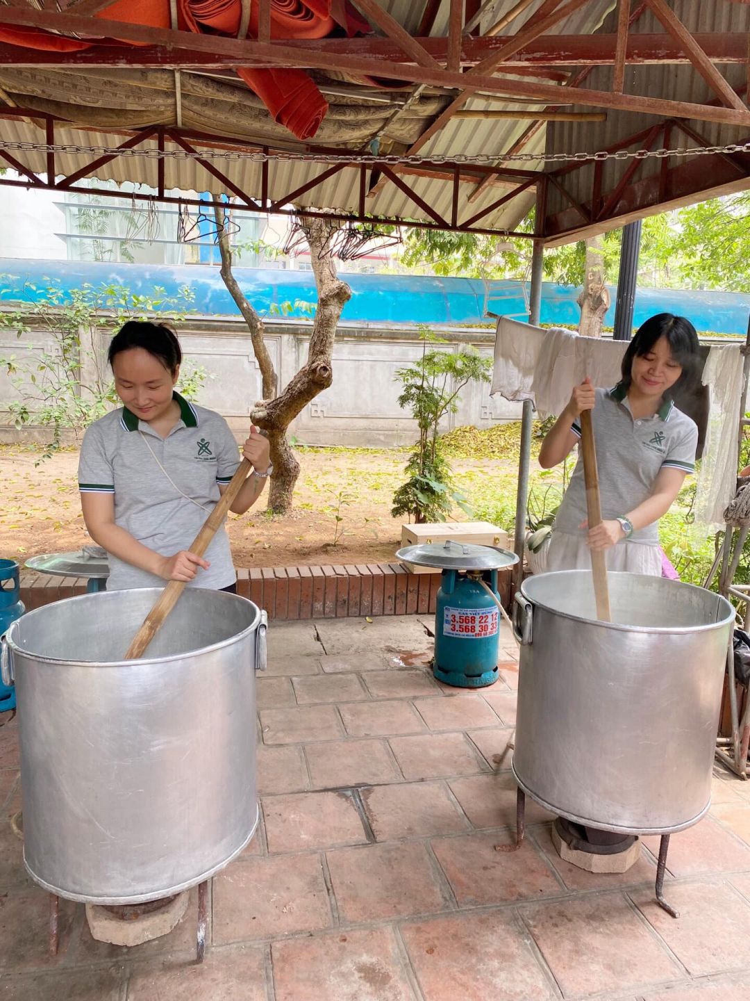 Tuần này đến nấu cháo có thầy cô, phụ huynh, học sinh trường liên cấp Newton, lực lượng rất đông. Buổi chiều nấu cháo xong còn lại 5 thành viên, Vừa mời cháo vừa phát cháo.