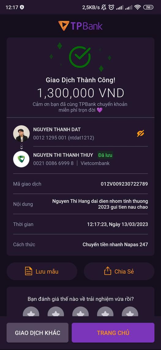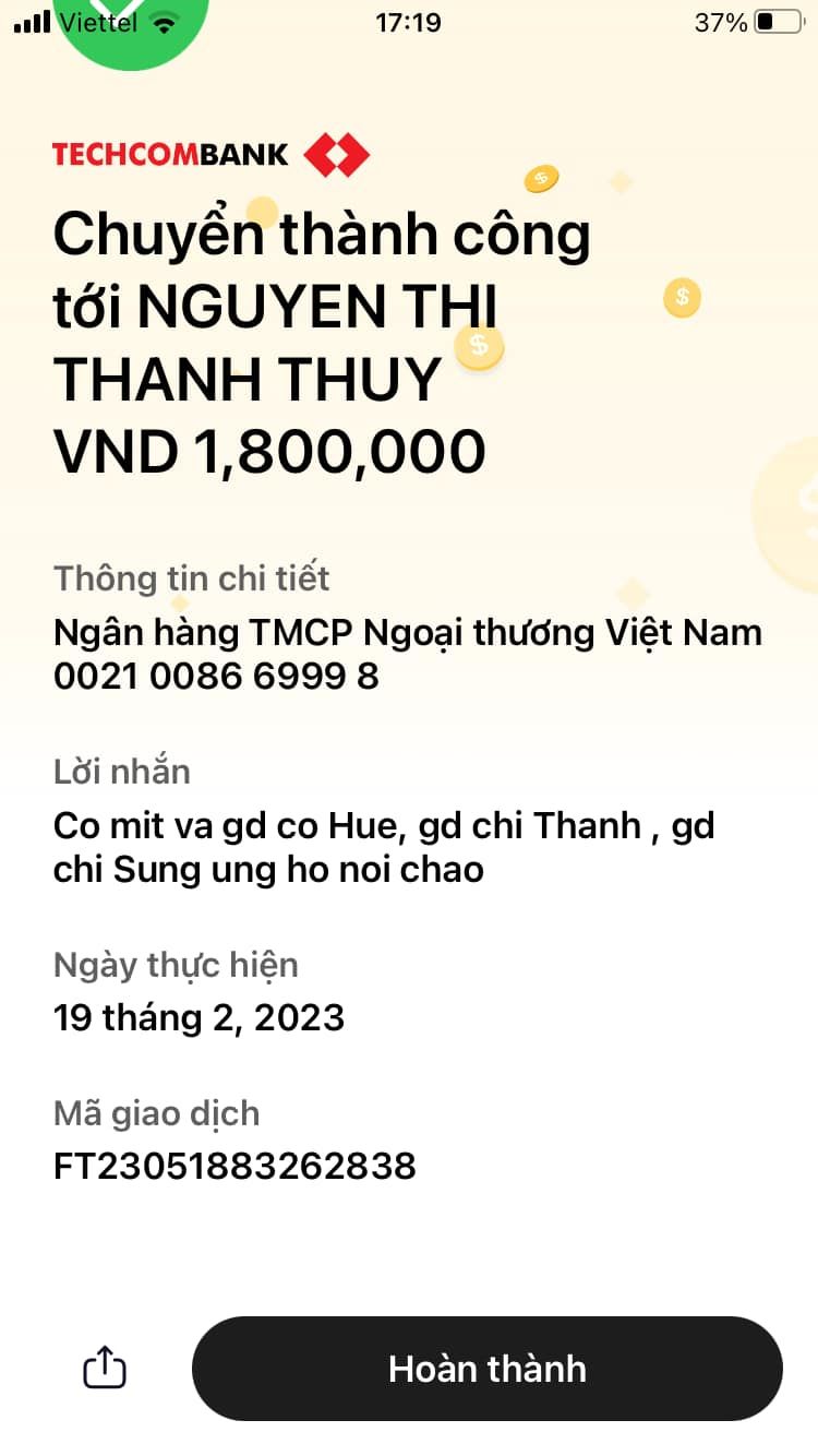 @trangvitgioi : Em chuyển số tiền trên cho thủ quỹ Thino của nồi cháo Hà Nội dùm nhé.